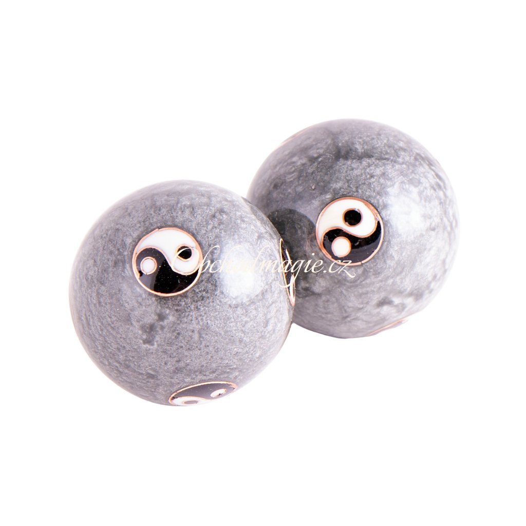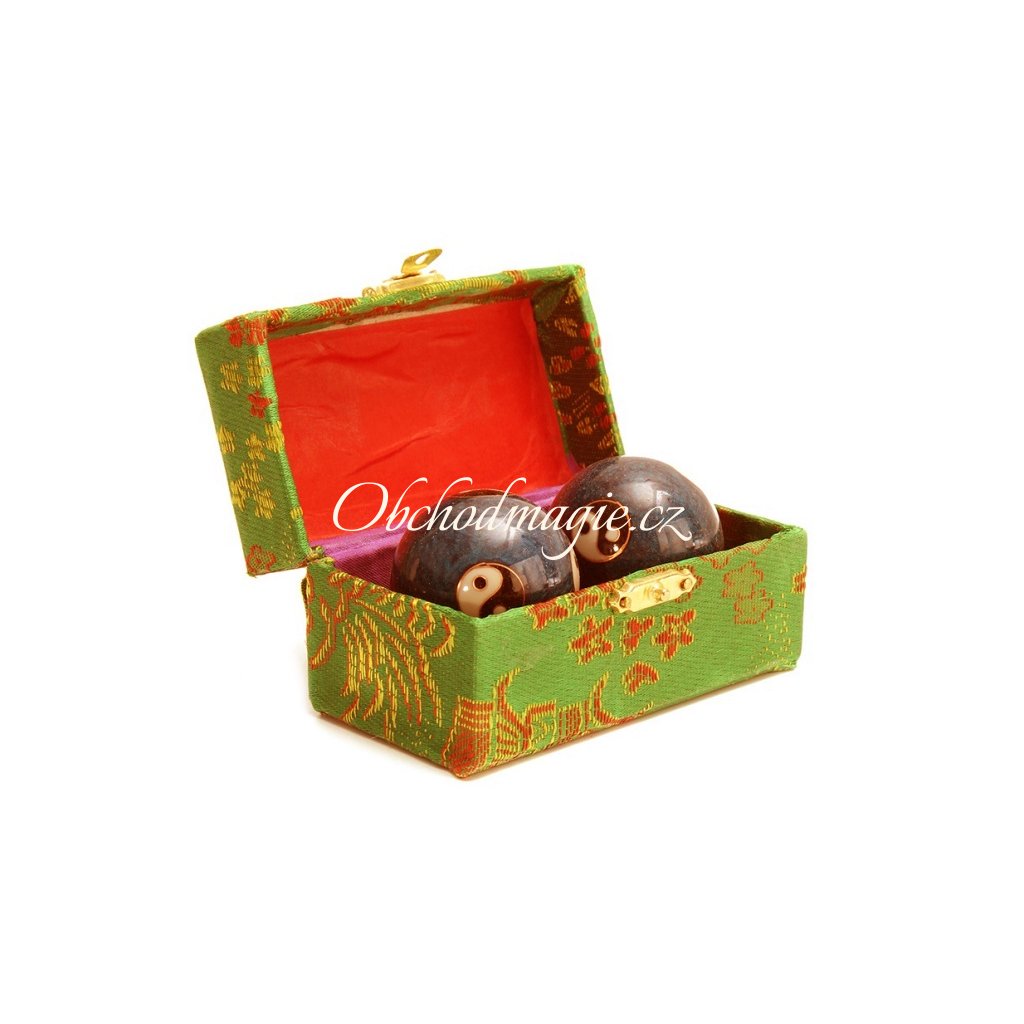 Kvalitní akupresurní koule s nádhernou dekorací v podobě Jin Jang, dodáváme v páru, uložené v dárkovém hedvábném boxu s brokátovým polstrováním.
