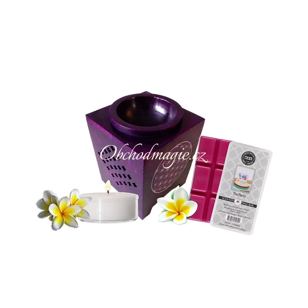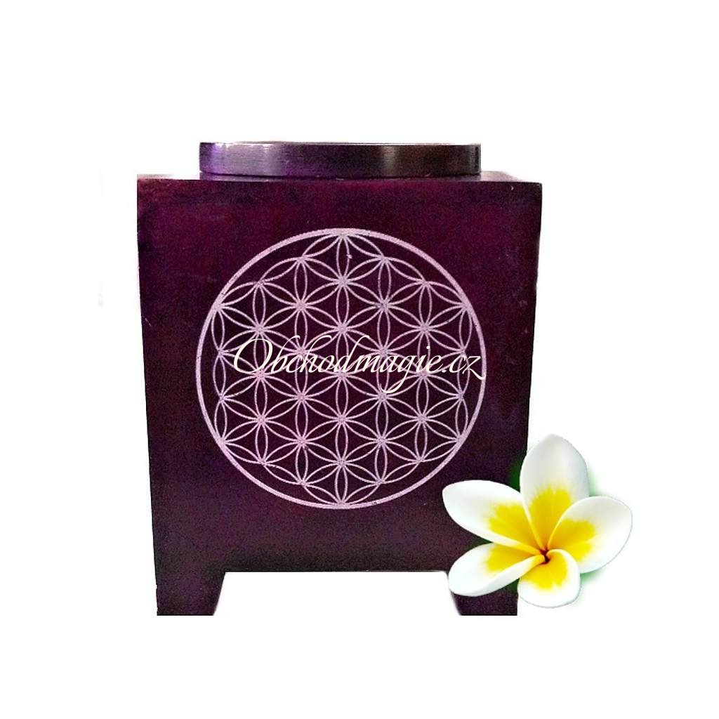 - vybroušena z kvalitního, přírodního a leštěného mastku fialové barvy, na přední straně bohatě zdobena gravírovaným symbolem posvátné geometrie Květu života, z boku a zezadu pak ornamentálními výřezy, kterými efektně prostupuje světlo zapálené čajové svíčky
