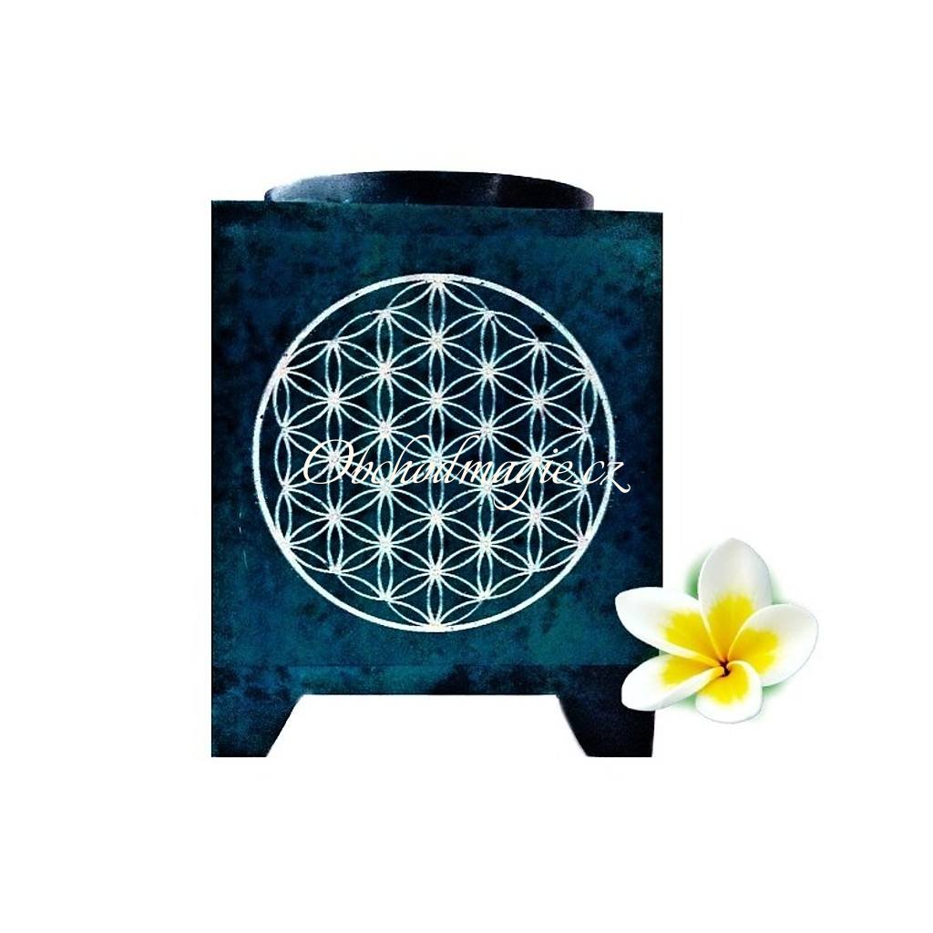 - vybroušena z kvalitního, přírodního a leštěného mastku modré barvy, na přední straně bohatě zdobena gravírovaným symbolem posvátné geometrie Květu života, z boku a zezadu pak ornamentálními výřezy, kterými efektně prostupuje světlo zapálené čajové svíčky
