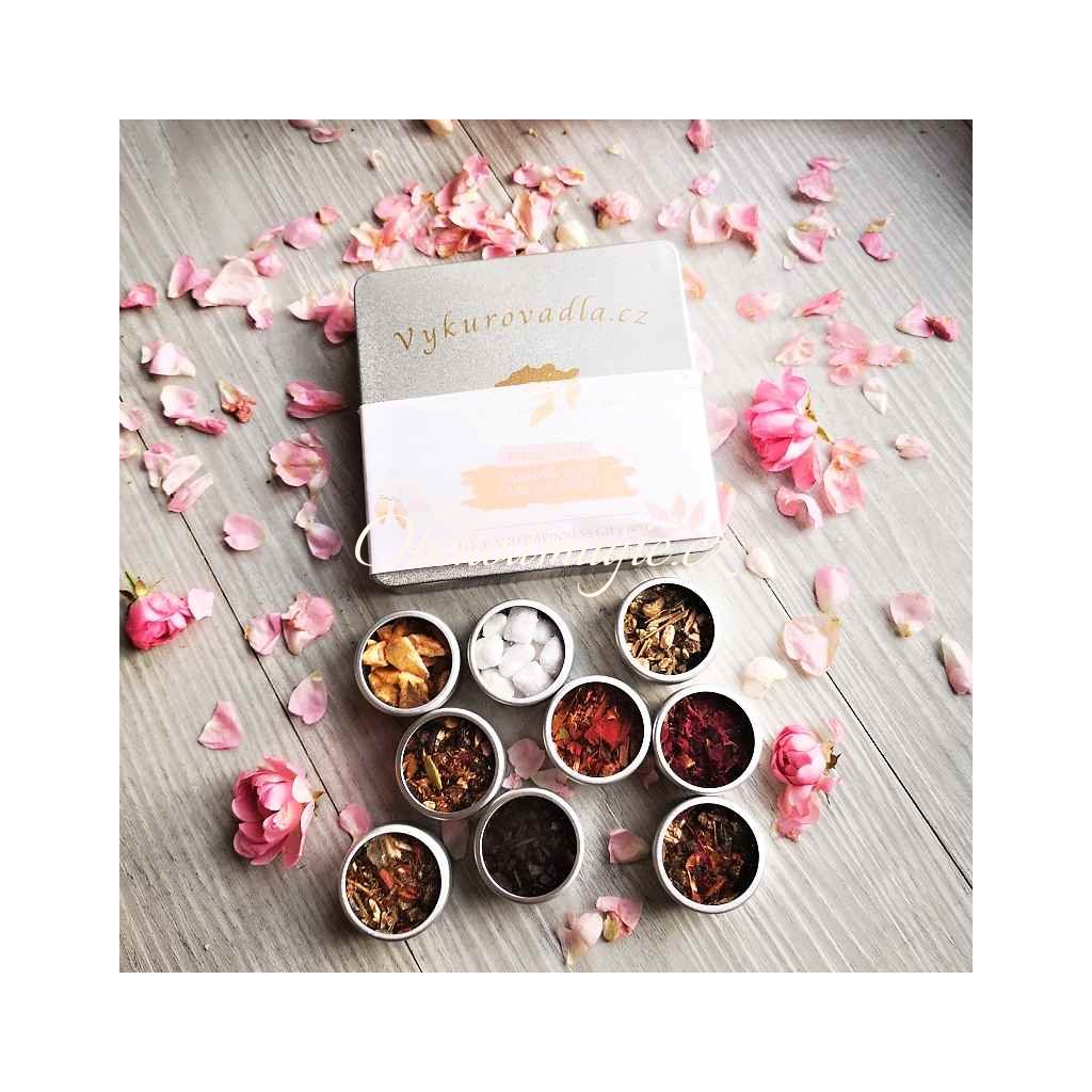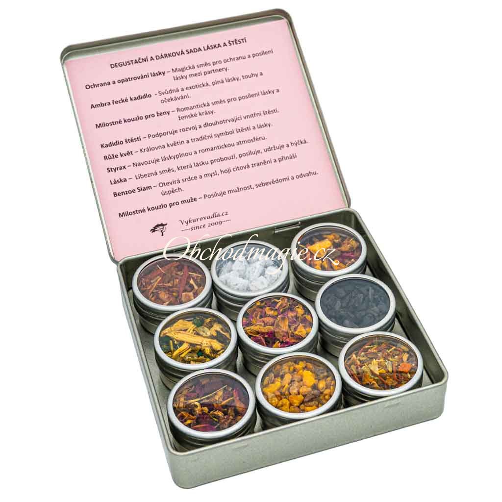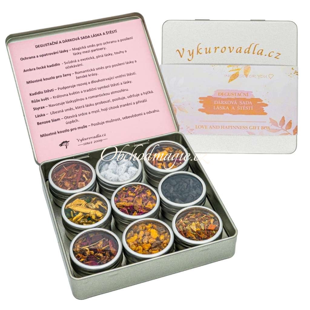 Balení: Designová plechová krabička se zlatým víkem a logem Vykurovadla. cz obsahuje devět vzorků vykuřovadel pro lásku a štěstí v malých plechových dózičkách s průhledem a praktickým šroubovacím úzávěrem. Každá dózička je zespodu označena názvem a v krabičce je vložen stručný popis jednotlivých druhů.