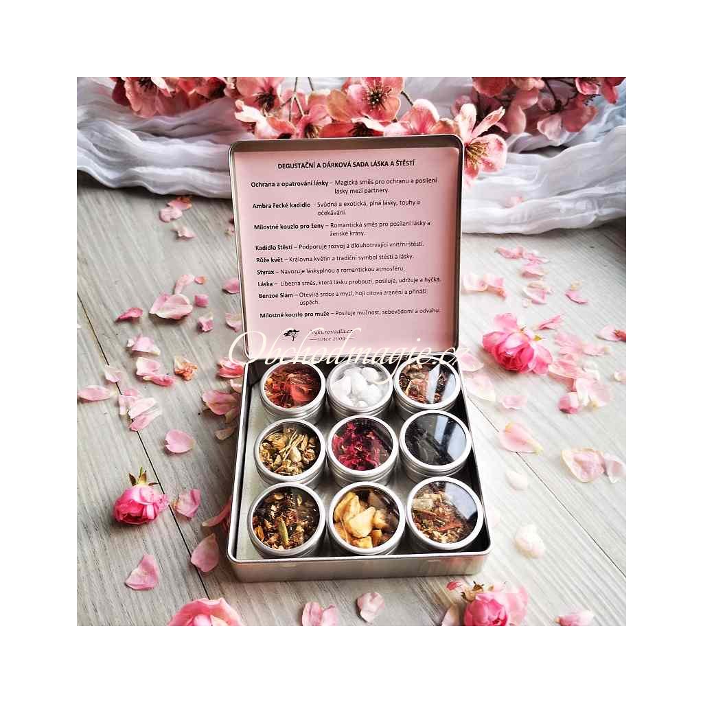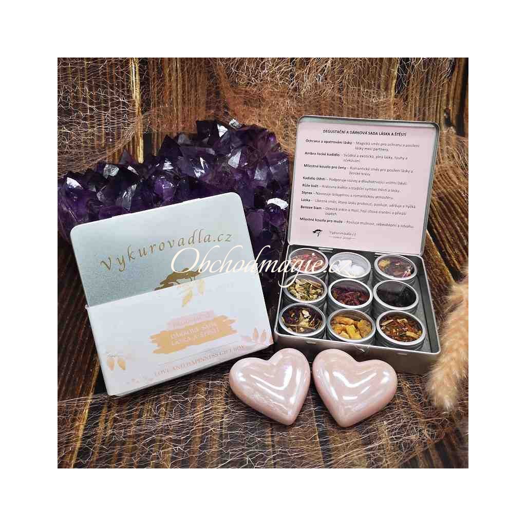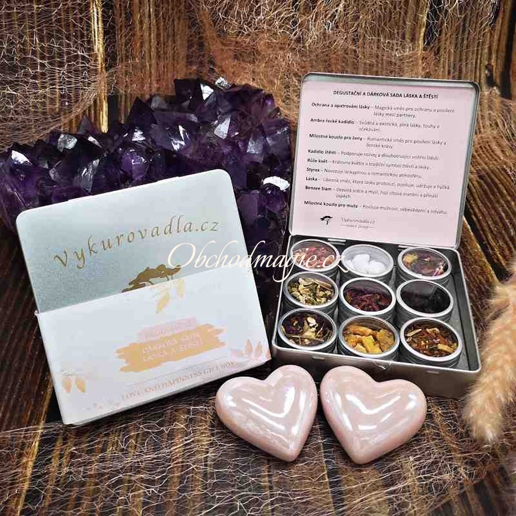 Dárková a degustační sada Láska a Štěstí je doslova nabitá láskyplnými vibracemi. Romantické, sladce balzamické, květinové a smyslné tóny vybraných devíti druhů vykuřovadel vydávají při hoření opojně euforickou vůni, která otevírá srdce čisté lásce, léčí a hojí citová zranění, lásku prohlubuje a upevňuje. Vůně, která přivede do vašeho života lásku i hluboké štěstí.
