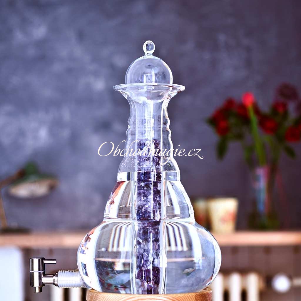 - demižon má uprostřed skleněnou vložku, do které lze přidat led na ochlazení nápojů, nebo drobné drahé kamínky, minerály, šungit a jiné energetizující prostředky, které vaše nápoje ještě více posílí