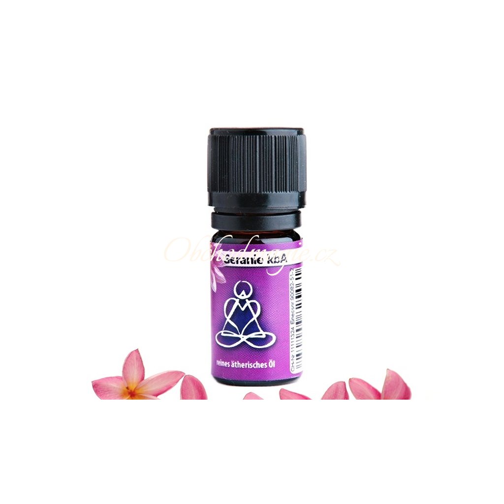 - Příjemná květinová vůně vzácného růžového geránia má výrazné zklidňující a uzemňující účinky, které ocení zejména ženy v období menstruace. Ulevuje od stresu a starostí, vyrovnává a harmonizuje mysl, uklidňuje rozbouřené emoce, navozuje pocity pohody a dobré nálady. Stimuluje nadledvinky a vyvažuje hormonální systém. Má vynikající účinky na plěť, obnovuje její přirozenou pružnost a pevnost, vhodný pro mastnou i suchou pleť. Unavenému tělu navrací energii. Použitý jako repelent odpuzuje hmyz.