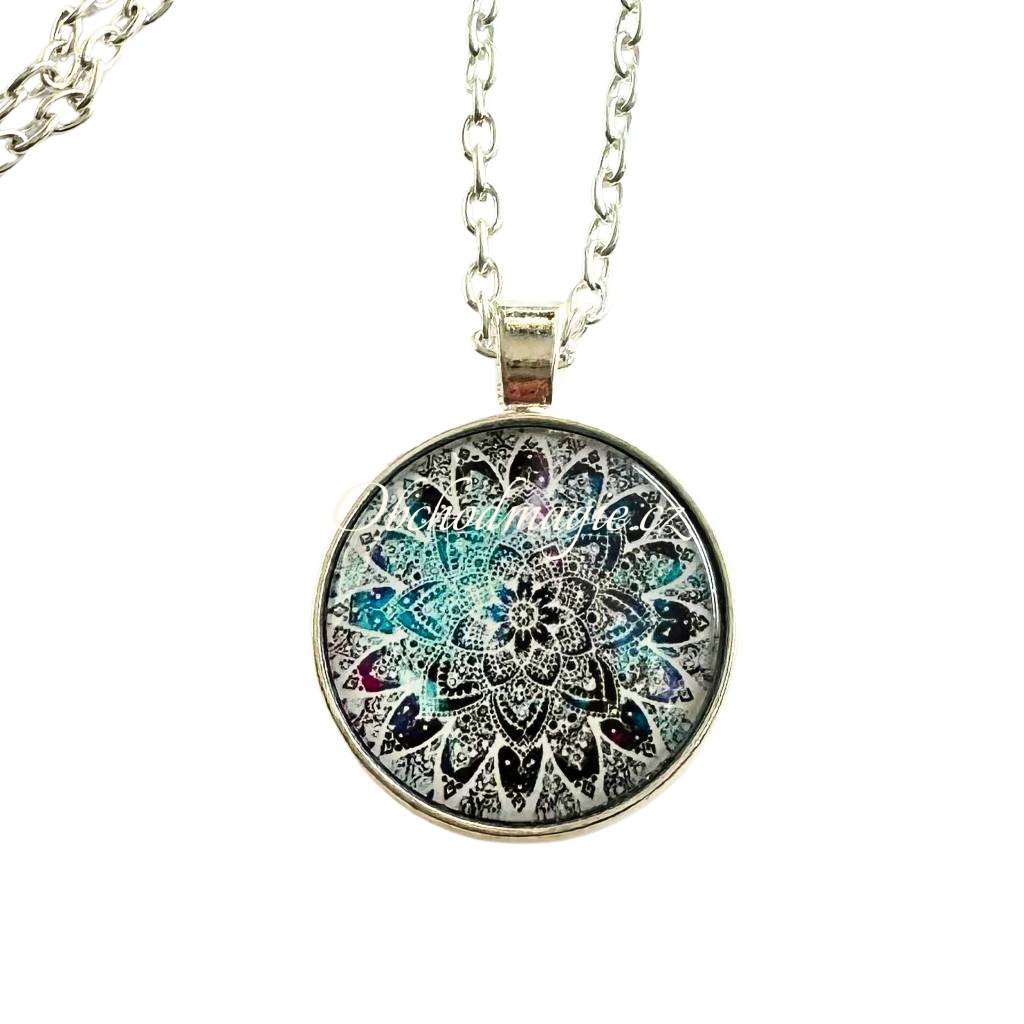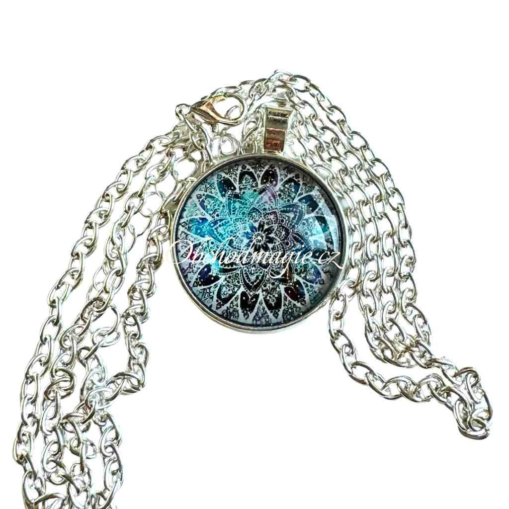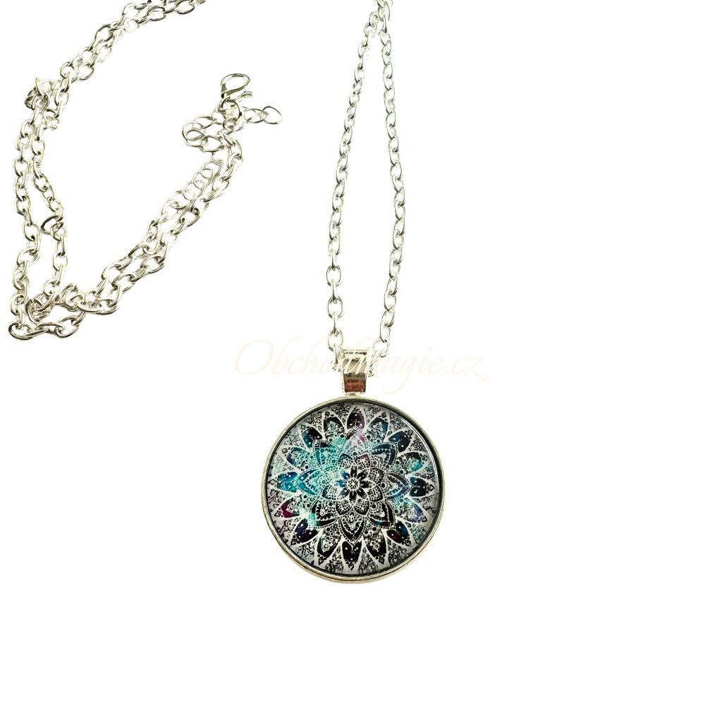 - přívěsek s řetízkem je vyroben z kvalitního obecného bižuterního kovu stříbrné barvy, uvnitř přívěsku je v křišťálovém skle vyobrazen posilující symbol mandaly v magickém kruhu