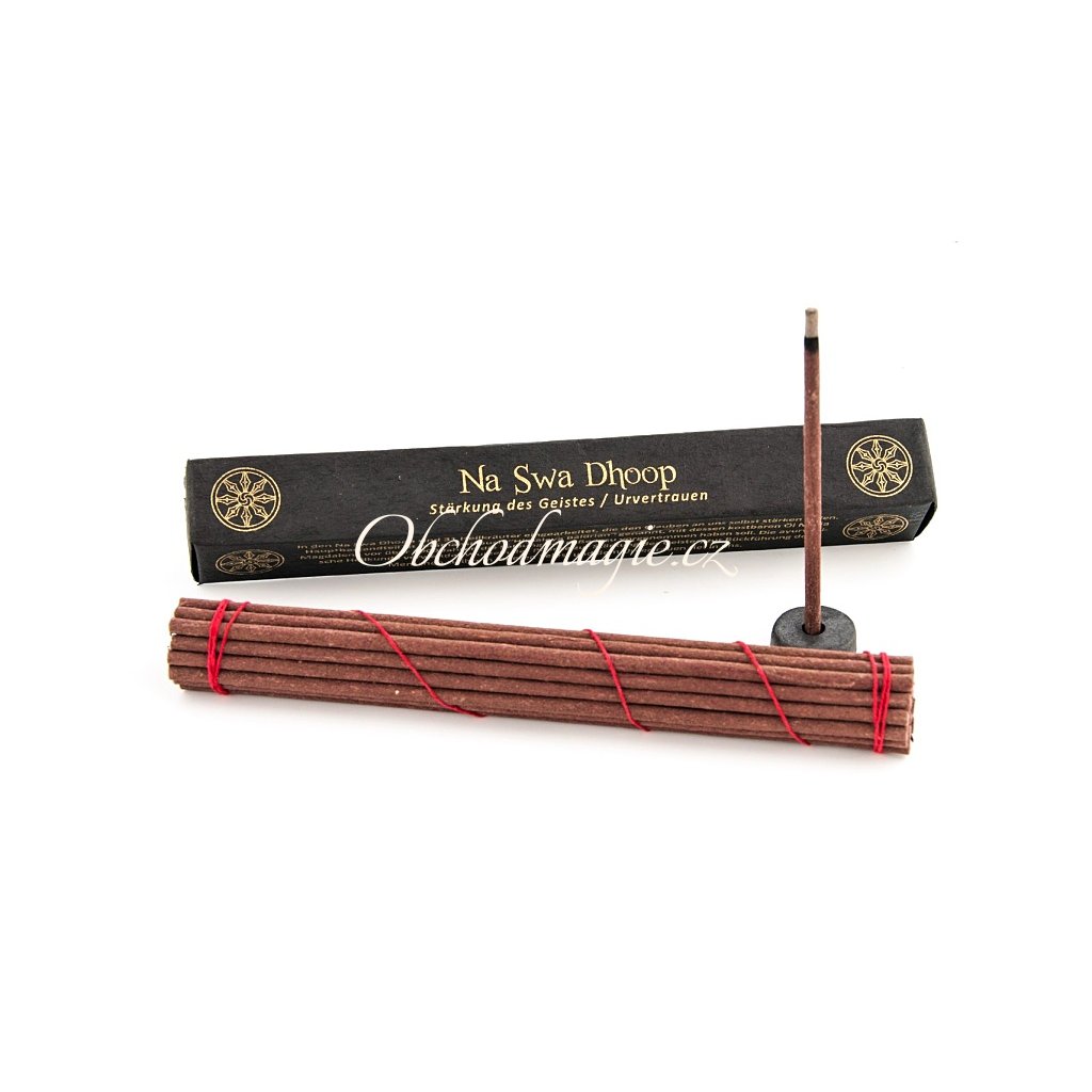 Vonné tyčinky Na Swa Dhoop jsou směsí 31 léčivých bylin, zaměřených zejména na posílení vnitřní sebedůvěry, nalezení klidu a míru, celkového zklidnění a posílení víry v sama sebe.