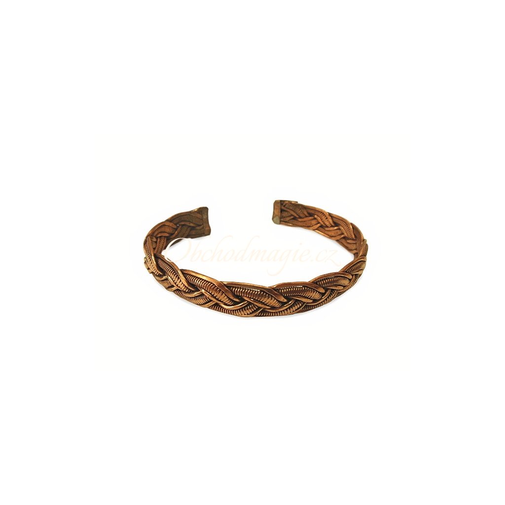 Bohatě pletený měděný náramek s jemným vzorem a posilujícím účinkem léčivým účinkem. Na konci je otevřený, takže ho můžete snadno přizpůsobit velikosti každého zápěstí.
