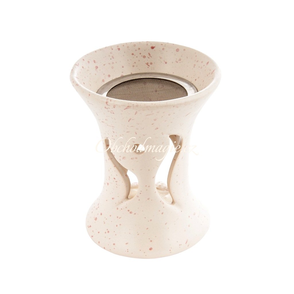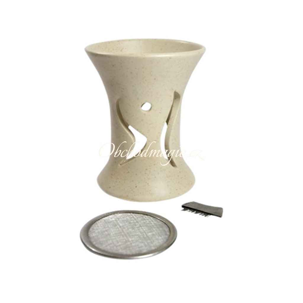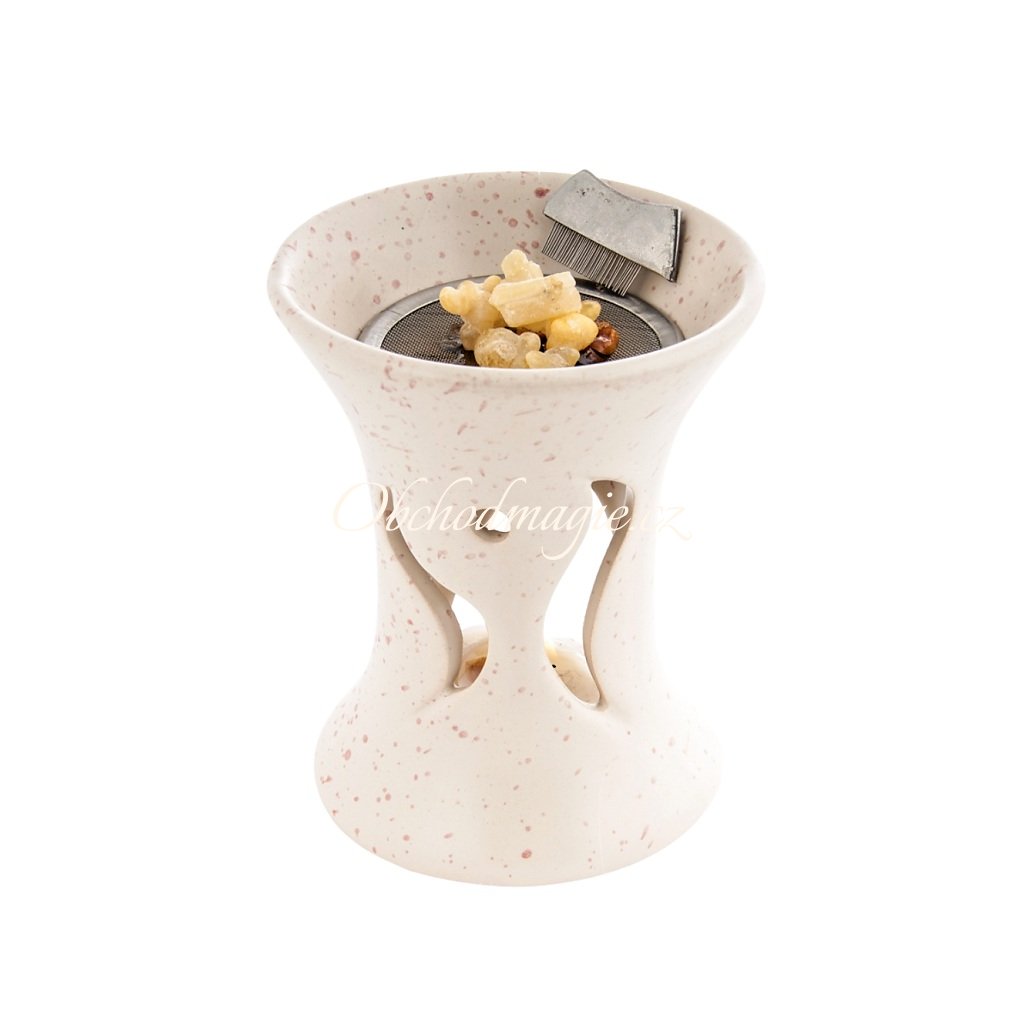 Praktická lampička, vhodná zejména k jemnému k vykuřování pryskyřic, bylin, voných dřev a vykuřovacích směsí z bílé keramiky. S příslušenstvím.