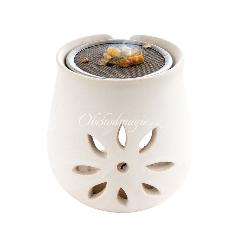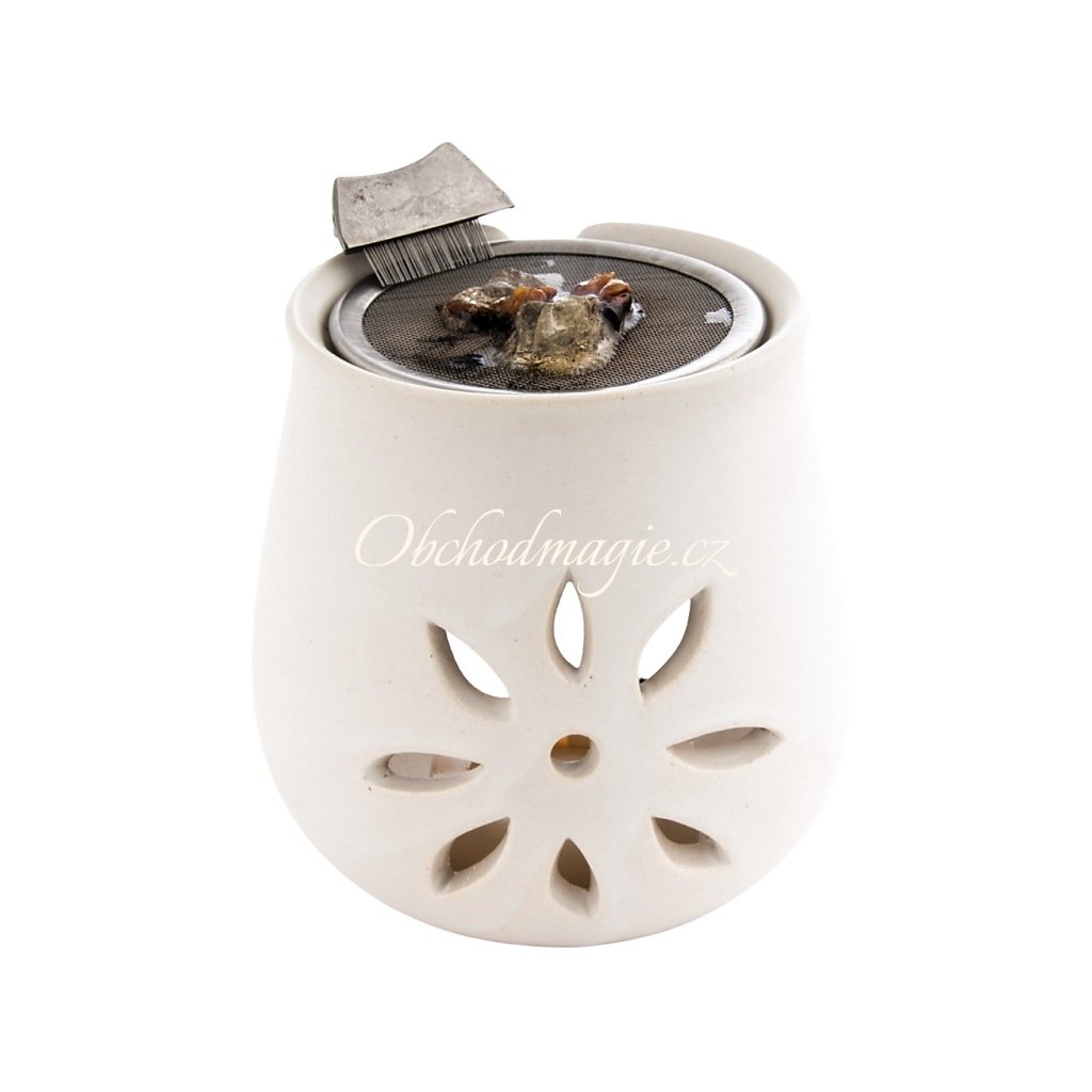 Praktická lampička, vhodná zejména k jemnému k vykuřování pryskyřic, bylin, voných dřev a vykuřovacích směsí z bílé keramiky. S příslušenstvím.